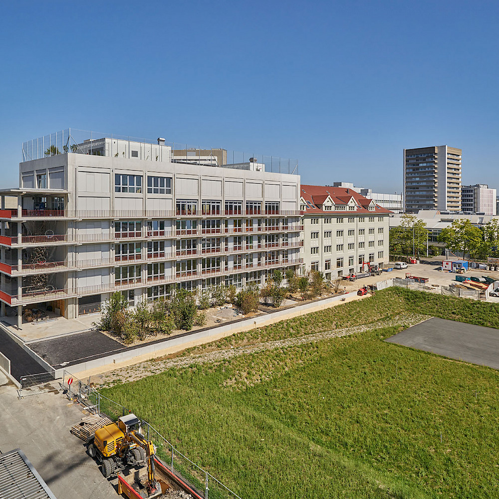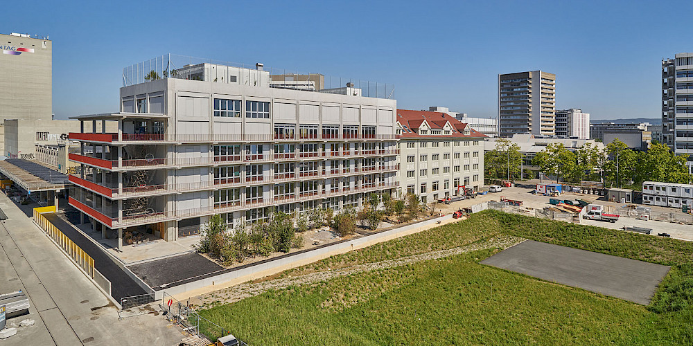 In einem ehemaligen Verwaltungsgebäude sind das neue Primarschulhaus Lysbüchel sowie Flächen für Kultur, Bildung und Büros entstanden.